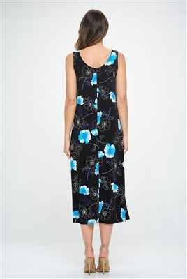 Long tank dress - black with blue flowers - polyester/spandex
